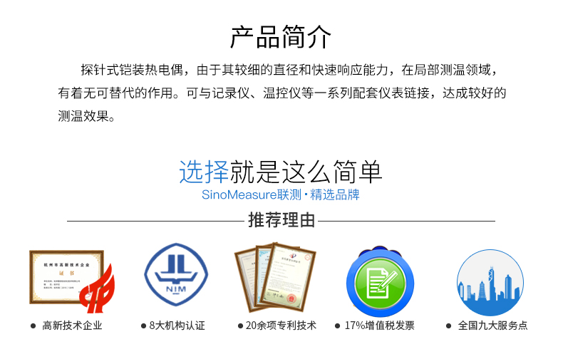 探針式鎧裝熱電偶,由于其較細(xì)的直徑和快速響應(yīng)能力,在局部測溫領(lǐng)域, 有著無可替代的作用。可與記錄儀、溫控儀等一系列配套儀表鏈接,達(dá)成較好的測溫效果。
