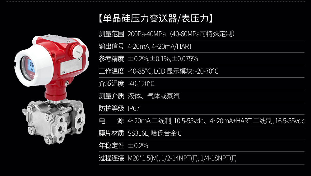 SIN-P3000G單晶硅壓力變送器用于測(cè)量液體、氣體或蒸汽的液位、密度、壓力,然后將其轉(zhuǎn)變成4-20mAHART電流信號(hào)輸出,也可與HART375或BST Modem相互通信,通過(guò)他們進(jìn)行參數(shù)設(shè)定、過(guò)程控制。與傳統(tǒng)壓力變送器的區(qū)別在于它使用的是納米單晶硅作為傳感器材料。